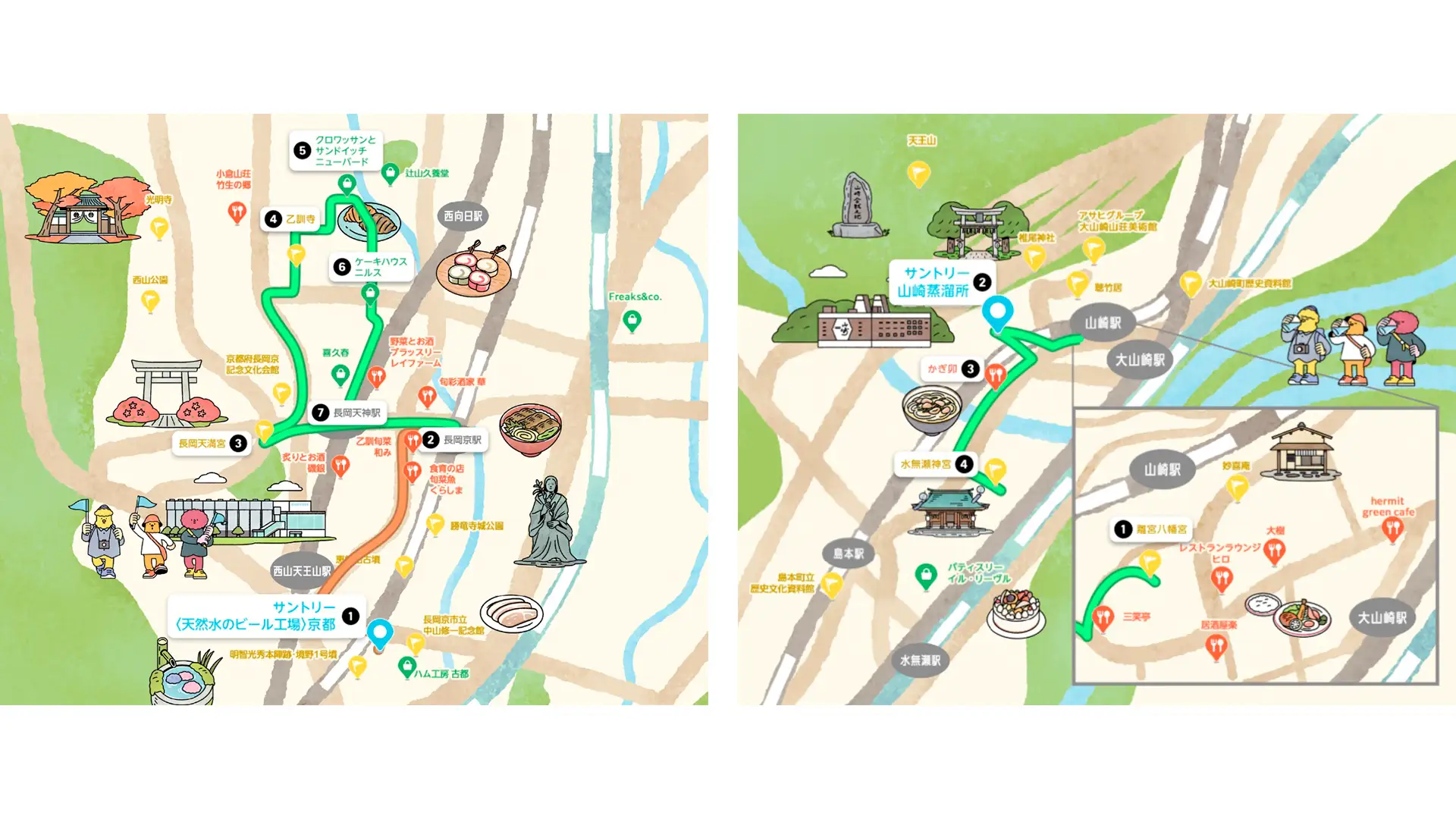 今回、Strolyで公開された「ファクトリップMAP」は、「サントリー〈天然水のビール工場〉京都エリア」「サントリー山崎蒸溜所エリア」の2エリアで、サントリー工場見学サイト「ファクトリップ」の世界観を活かし、ファクトリップのキャラクターである「コウジョウケン」を活用した親しみのあるイラストデジタルマップです。実際にサントリーの工場見学に来場した方たちに対し、工場見学前後の体験価値を向上させ、周辺エリアの周遊を促すことで地域活性化につなげることを目的としています。