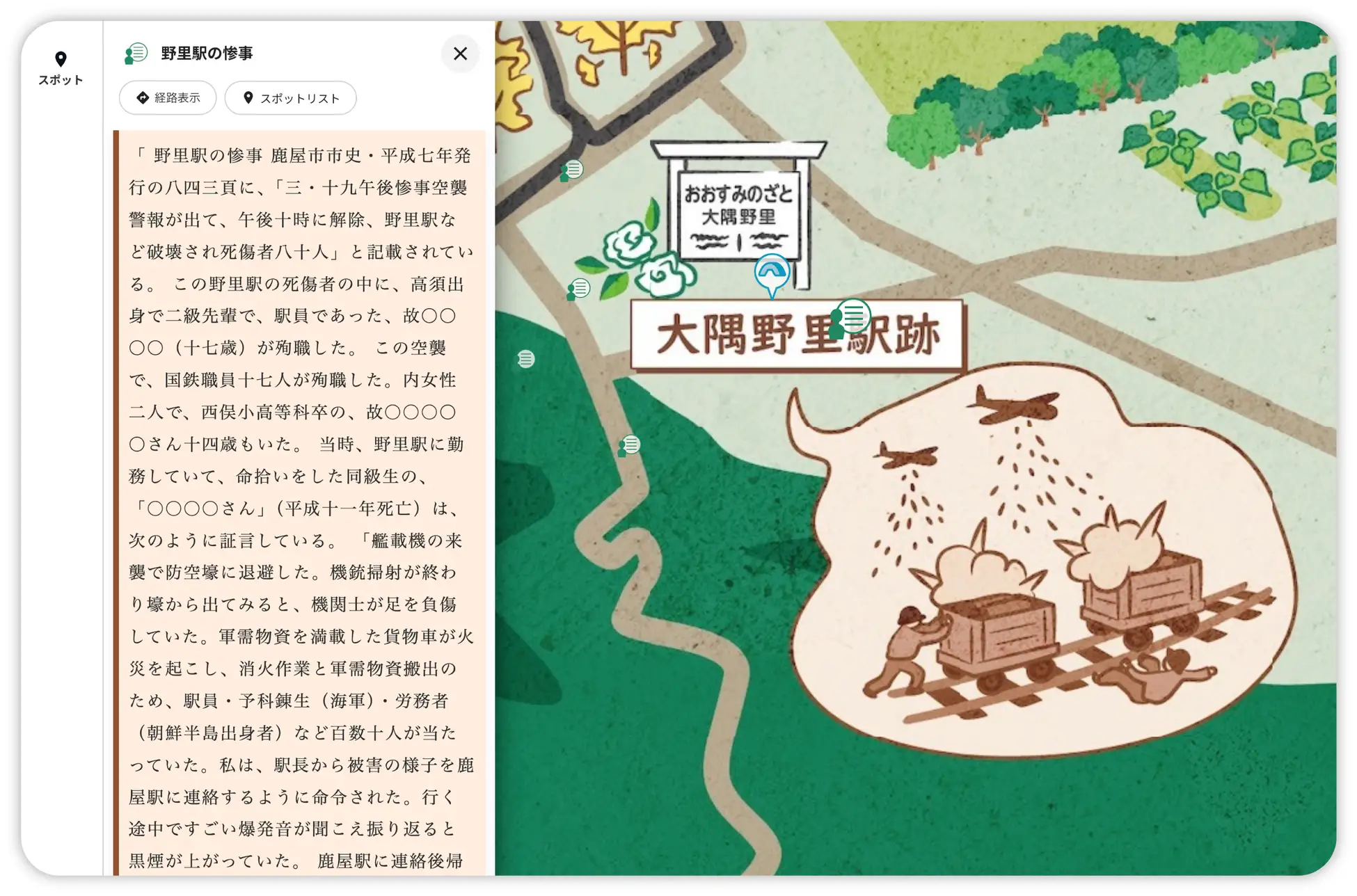 また、Strolyのスポット情報機能を使って、鹿屋市が制作した冊子「永遠の平和を願って―戦争体験談集―」(鹿屋市平和学習ガイド・調査員連絡会)に収められている証言を「エピソード」として挿入。“スポット”と“エピソード”をリンクさせ、市内の戦跡で実際に何が起こったか、何があったかを記しています。