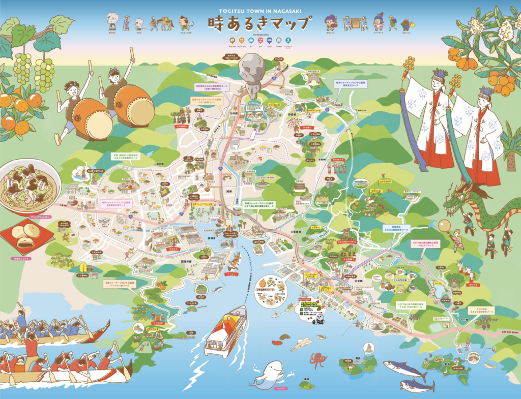 本マップは「住み続けたいまち」を目指す時津町が、町民と観光客のどちらにも活用してもらうことを目的に制作したイラストデジタルマップで、山と海に囲まれた自然豊かな海辺の町・時津町の魅力を、優しいタッチのイラストで表現しています。